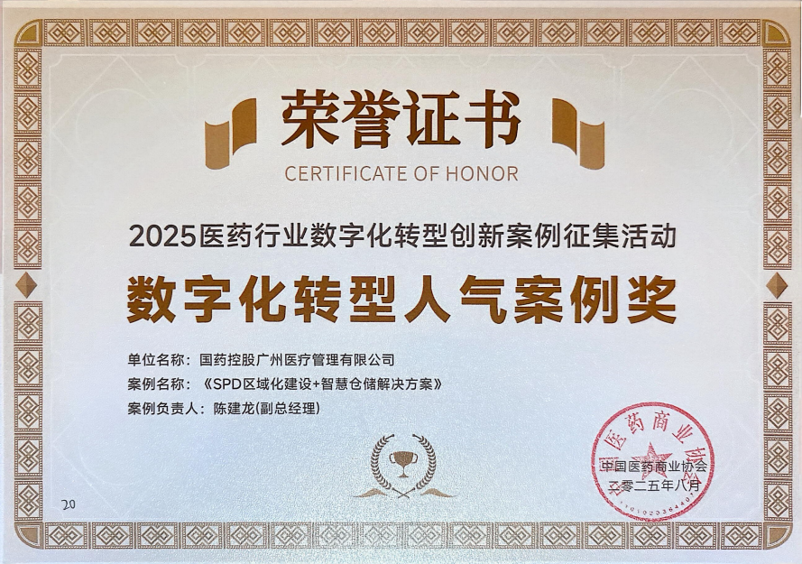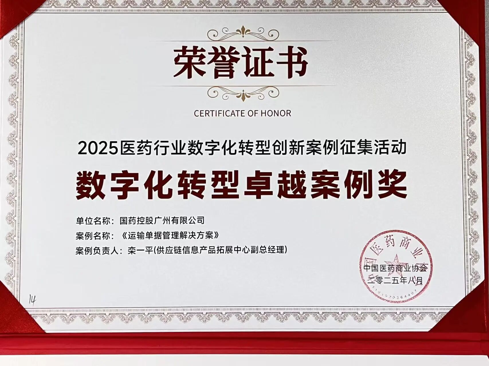 近日,在中国医药商业协会主办的2025医药行业数字化转型创新案例大赛上,国药控股广州有限公司凭借卓越的创新成果和技术突破,在众多企业中脱颖而出,四大医药供应链数字化创新案例一举斩获“数字化转型卓越案例奖”“数字化转型标杆案例奖”“数字化转型人气案例奖”共五个奖项。