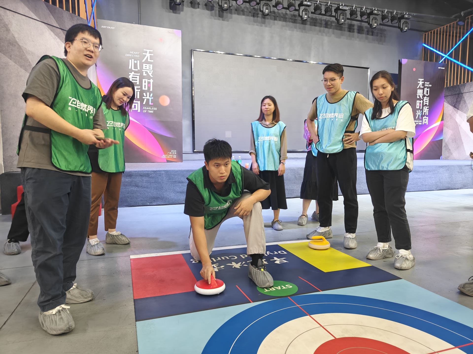 参赛选手分为6个小组,通过创意队形展示,让跨部门同事迅速破冰。在教练的指导下,选手们开展积分赛练习和清障赛练习,快速掌握了旱地冰壶相关知识技巧。比赛中队员紧紧盯着冰壶的轨迹,或半蹲在冰壶赛道的起点,思考着最佳的投掷策略,或站立一旁,与队友们商讨着下一步的战术布局。队员们互相鼓励、互相支持,共同为了胜利而努力拼搏。