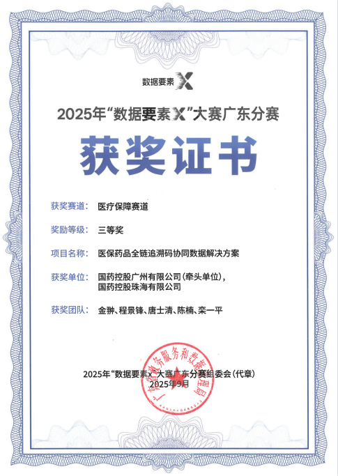 大赛自5月启动以来,吸引了来自省内外事业单位、企业、科研机构等超过1300个优秀项目同台竞技。经过初赛、决赛,通过线上评审、资质审查、技术验证、决赛路演等层层筛选,由国控广州作为申报主体、国控珠海共同参与的“医保药品全链追溯码协同数据解决方案”项目,凭借其创新性与实践价值,荣获省级决赛三等奖。