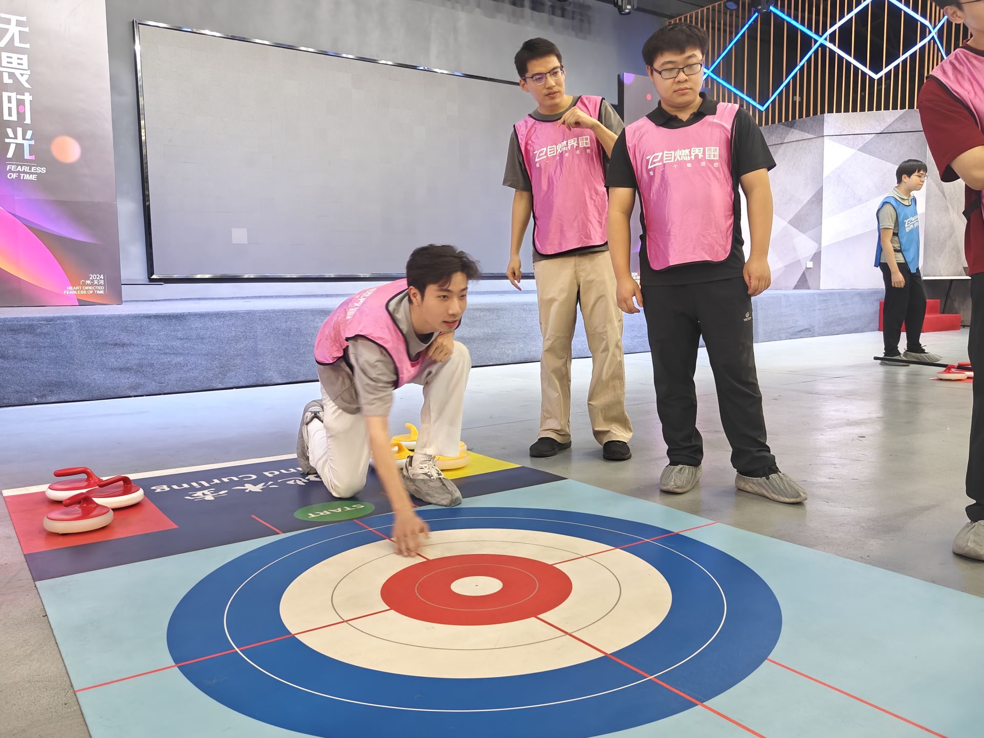 参赛选手分为6个小组,通过创意队形展示,让跨部门同事迅速破冰。在教练的指导下,选手们开展积分赛练习和清障赛练习,快速掌握了旱地冰壶相关知识技巧。比赛中队员紧紧盯着冰壶的轨迹,或半蹲在冰壶赛道的起点,思考着最佳的投掷策略,或站立一旁,与队友们商讨着下一步的战术布局。队员们互相鼓励、互相支持,共同为了胜利而努力拼搏。