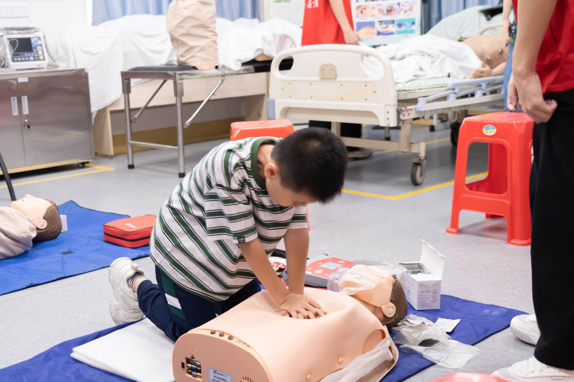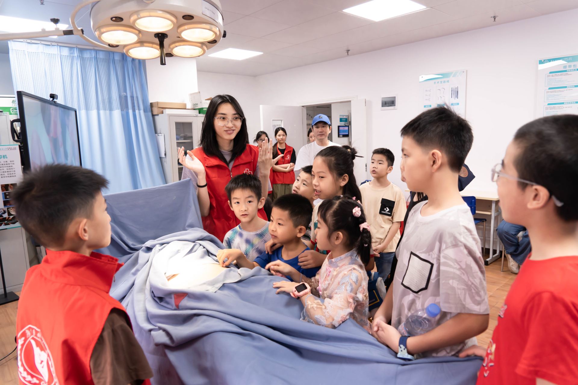 活动现场,孩子们参加了模拟医学专题讲座,了解医生的培训历程,并在志愿者的指导下参与创伤急救、模拟手术、心肺复苏等实操环节,孩子们化身“小医生”,在互动中学习医学知识,感悟生命珍贵。